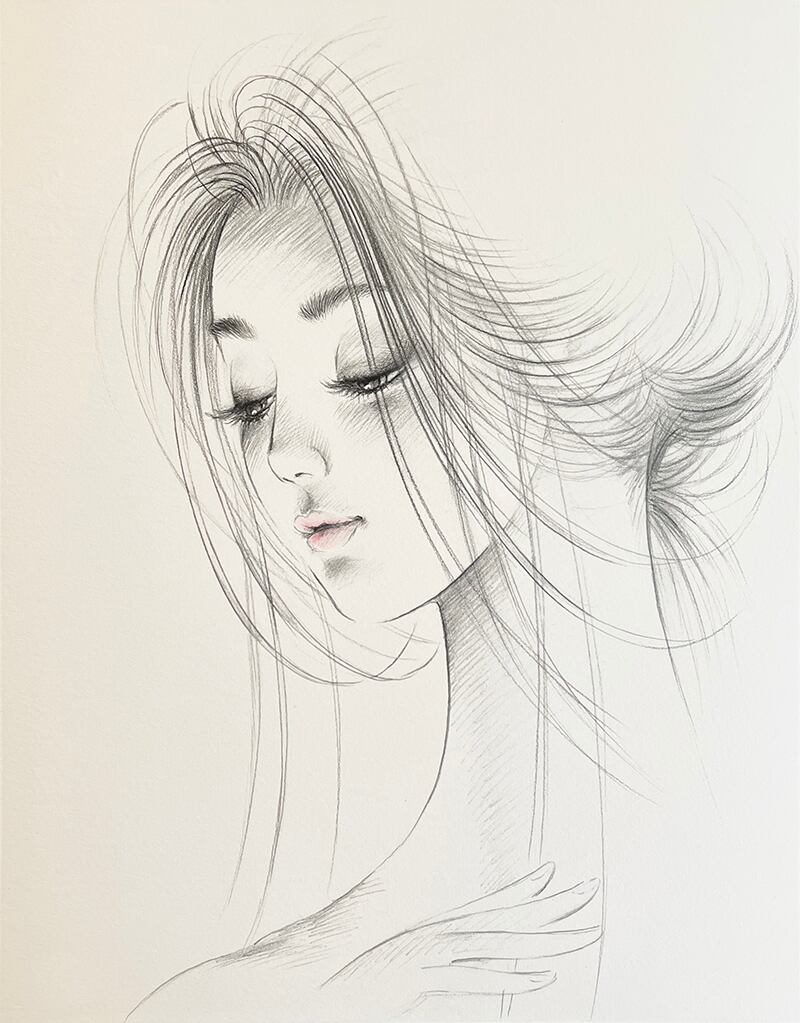 2023年 ジークレー+手彩 限定15部 直筆サイン入り 額装サイズ :562x 440mm イメージサイズ:390x305mm フレームカラー:シルバー うつむく「清楚な女性」に作家の手彩により唇をわずかに染め、息づかいを感じさせる作品。